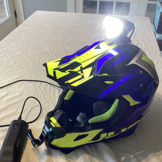 Oxbow motorcycle, two LED light unit attached to a motorcycle helmet. Powered by the motorcycle electrical system. 2100 Lu (max).